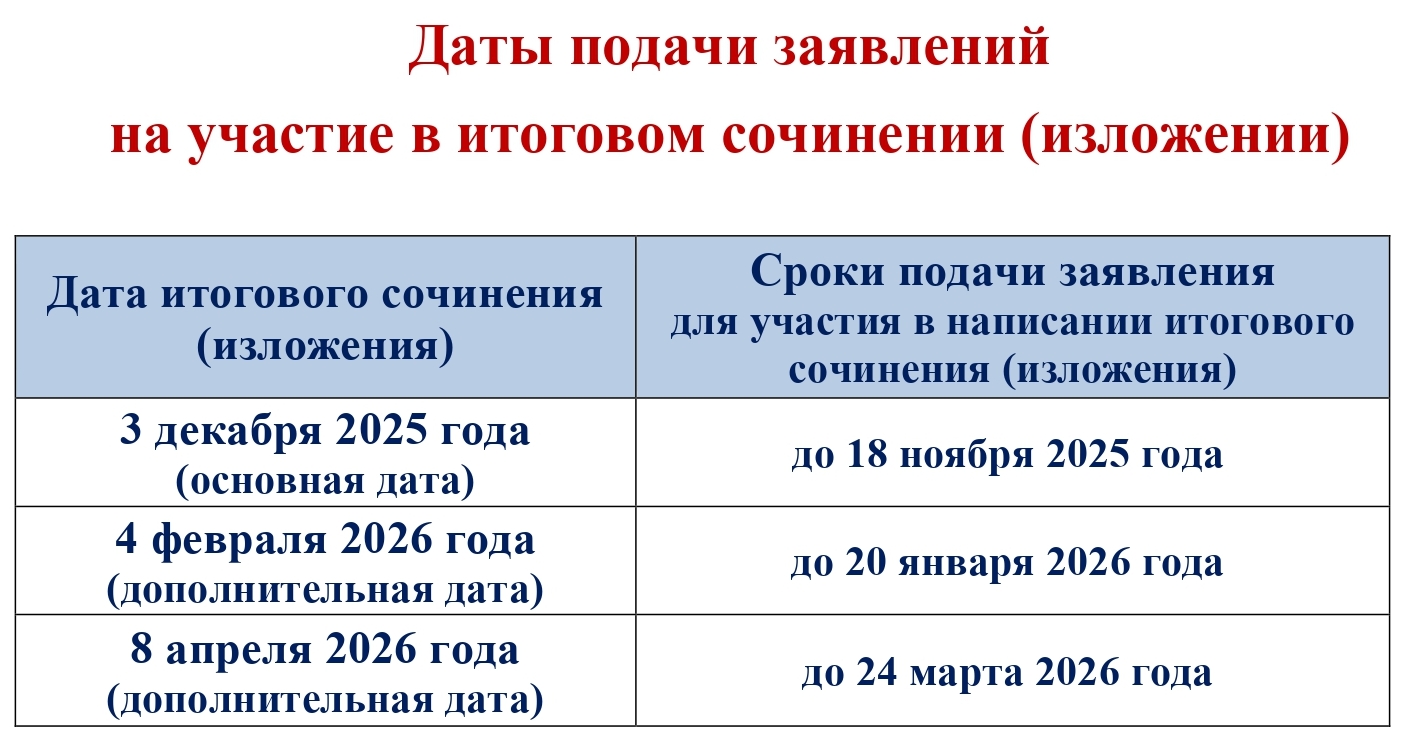 Для участия в написании итогового сочинения (изложения) необходимо подать заявление в своей образовательной организации или месте регистрации не позднее чем за две недели до начала проведения итогового сочинения (изложения):